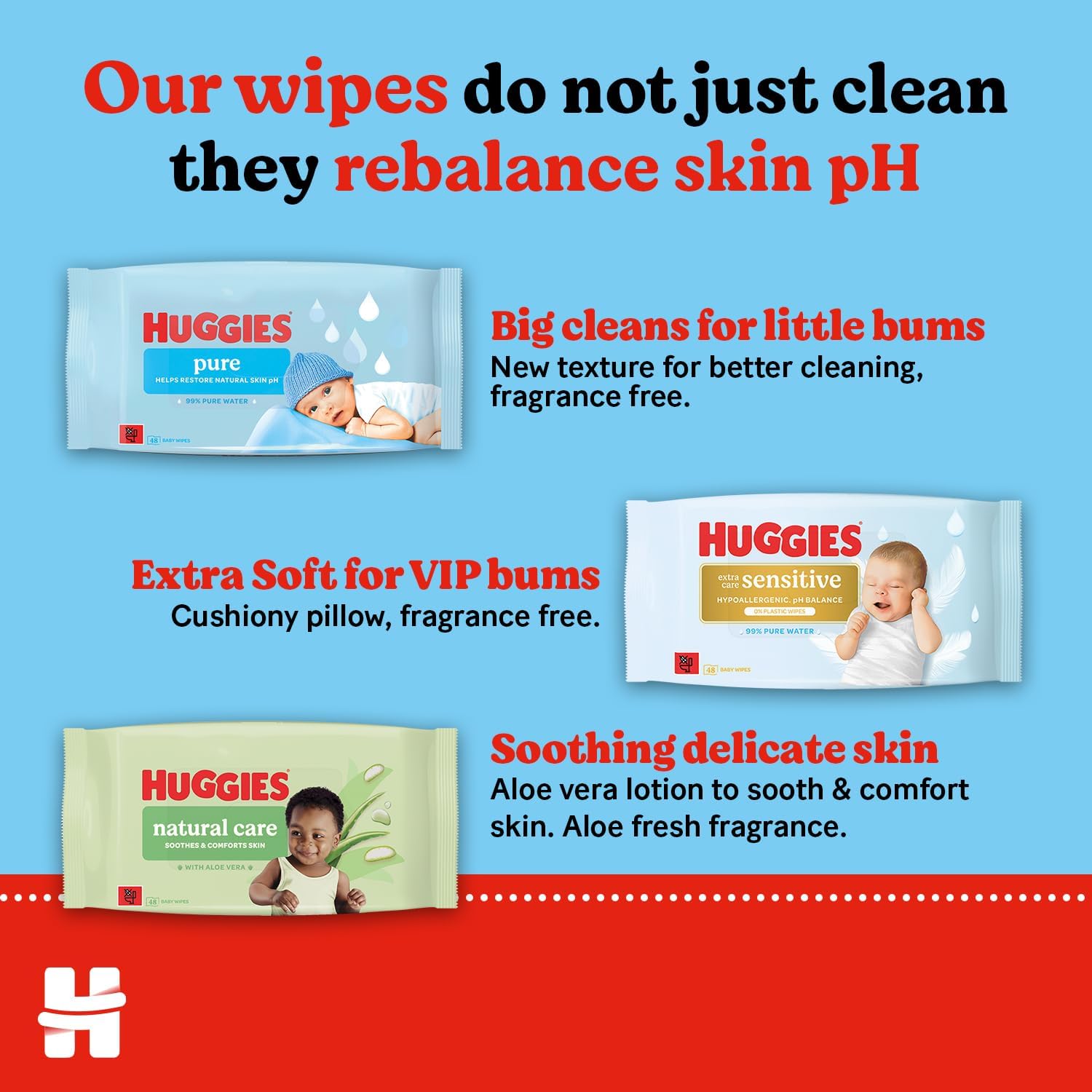 • REBALANCE SKIN pH New Huggies wipes don’t just clean, they help maintain healthy skin protecting against causes of skin irritation and rebalancing skin pH.