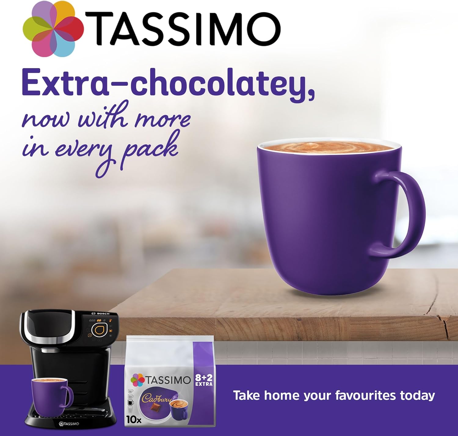 - BRINGING JOY TO EVERYDAY MOMENTS Tassimo has a huge range for you to discover; Whether it’s a hot choccolate, creamy latte, delicious cappuccino or intense espresso; We brew it perfectly at the touch of a button